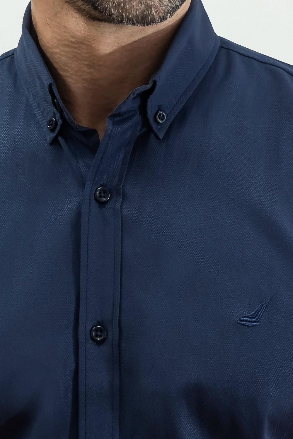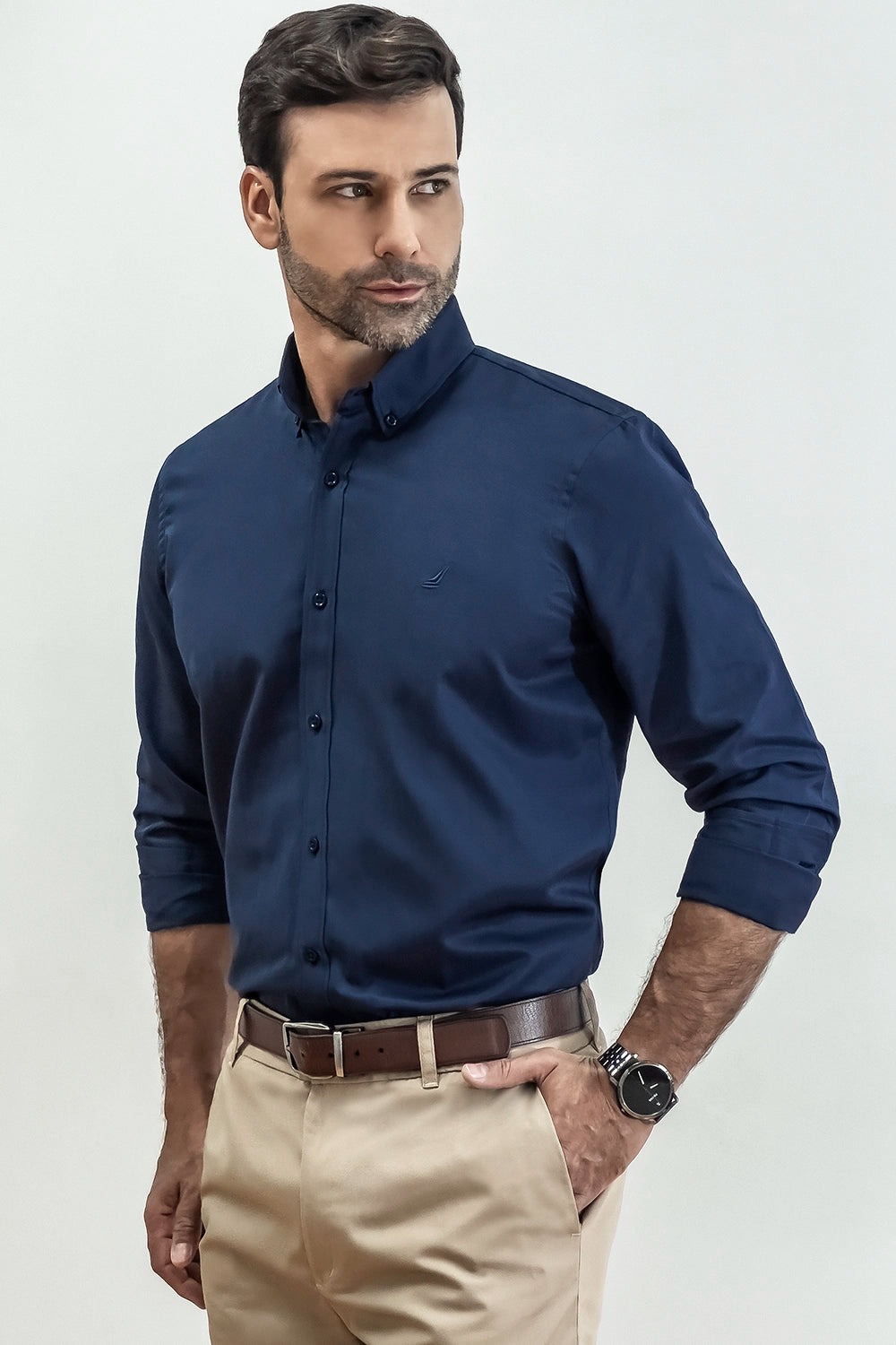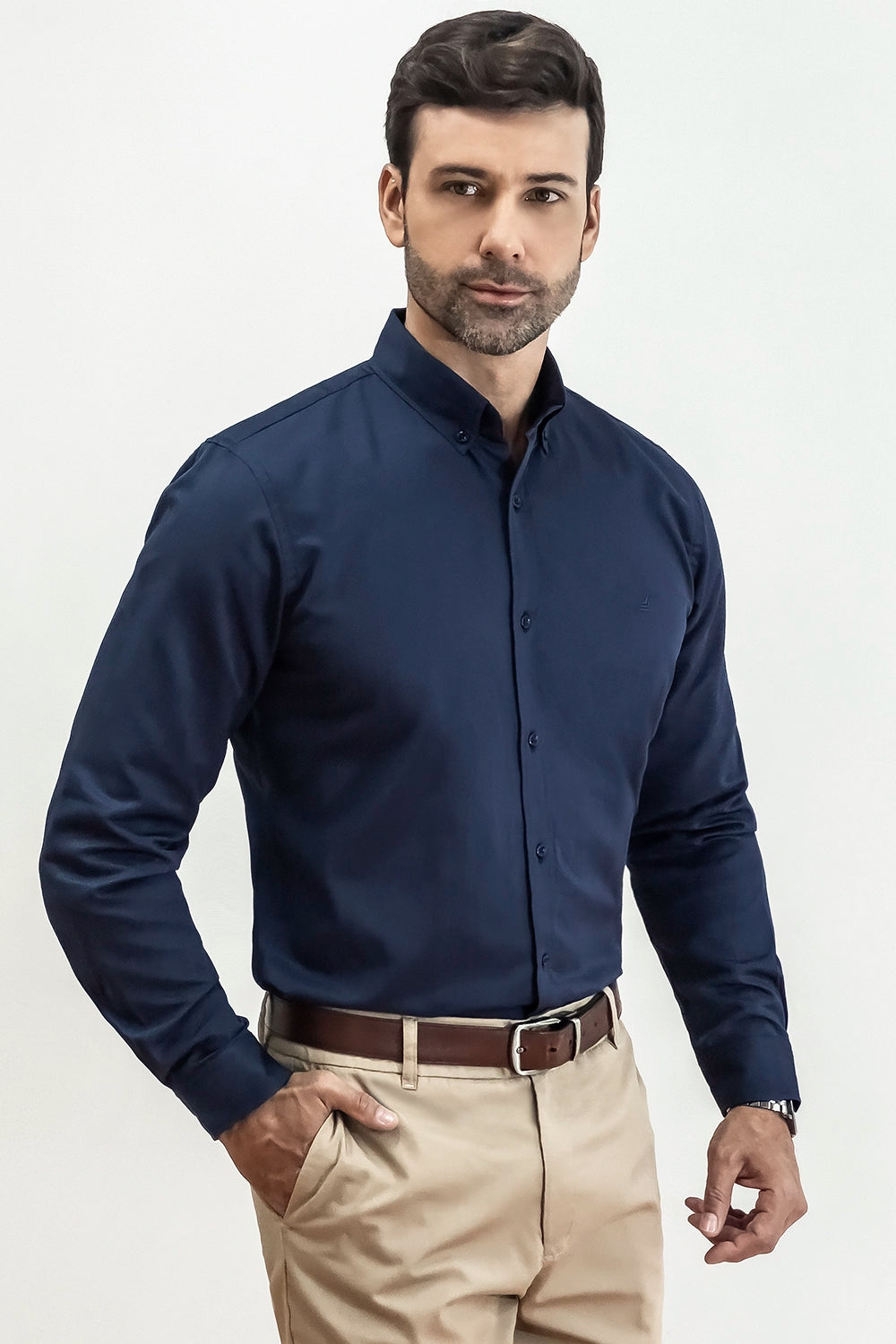 Incorpora un cuello francés con botón up que conserva su forma y aporta un toque clasico, manga larga y botonadura frontal clásica.
